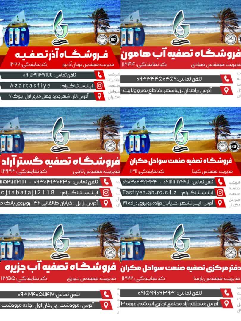 3-نمايندگی شهرستان زاهدان: استن سوب شهرستان زاهدان-زیبا شهر،تقاطع نصر و ولایت- فروشگاه تصفیه آب هامون